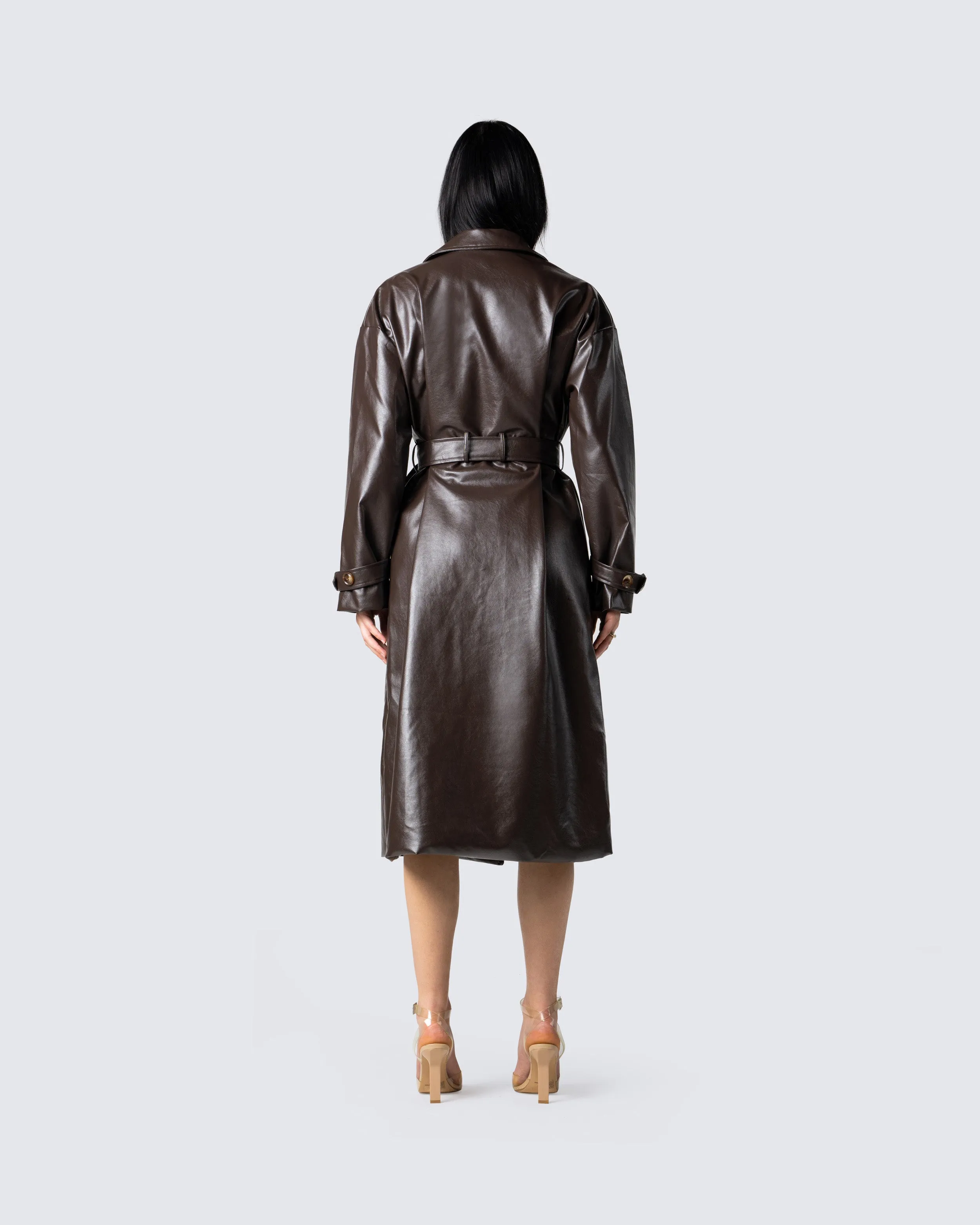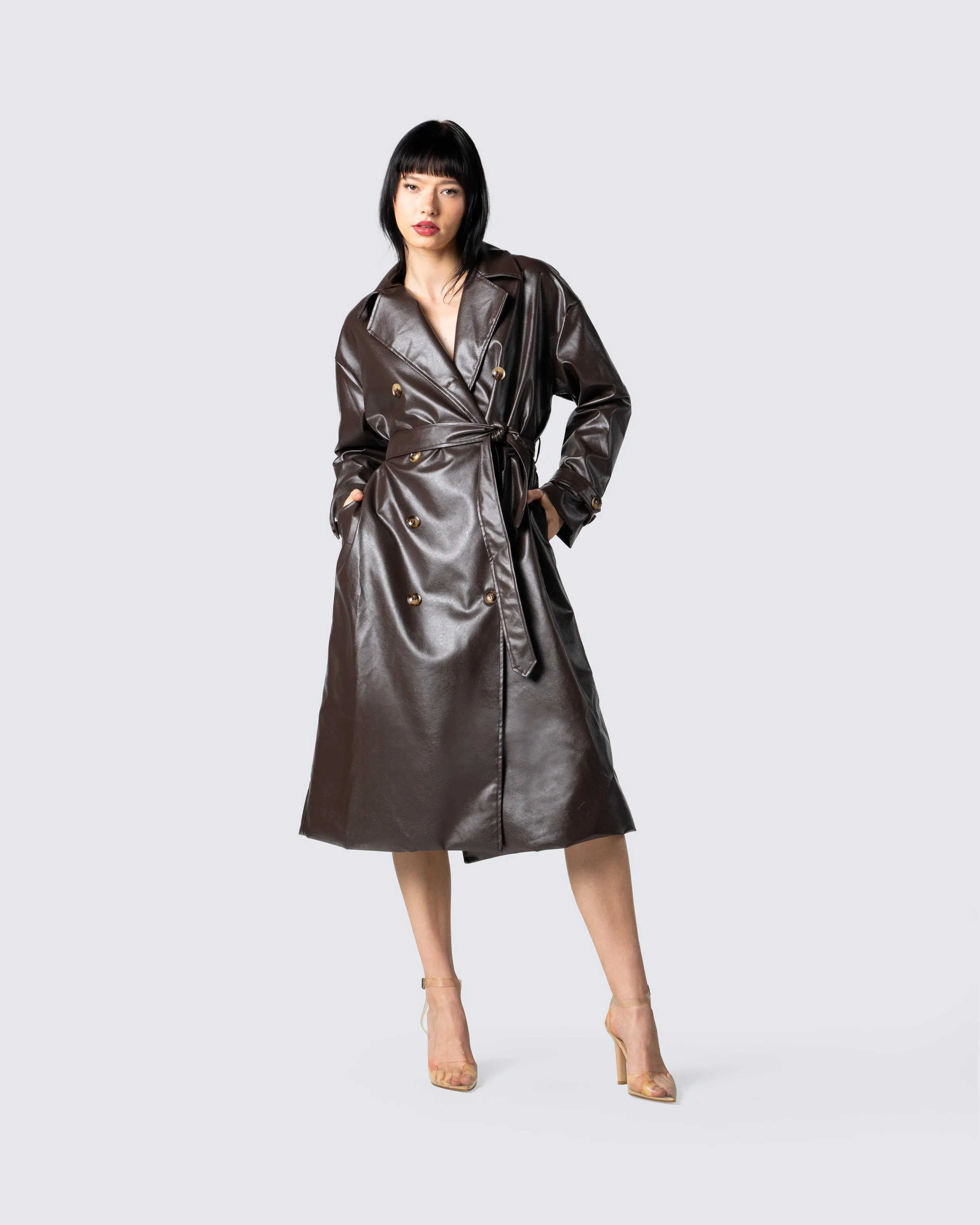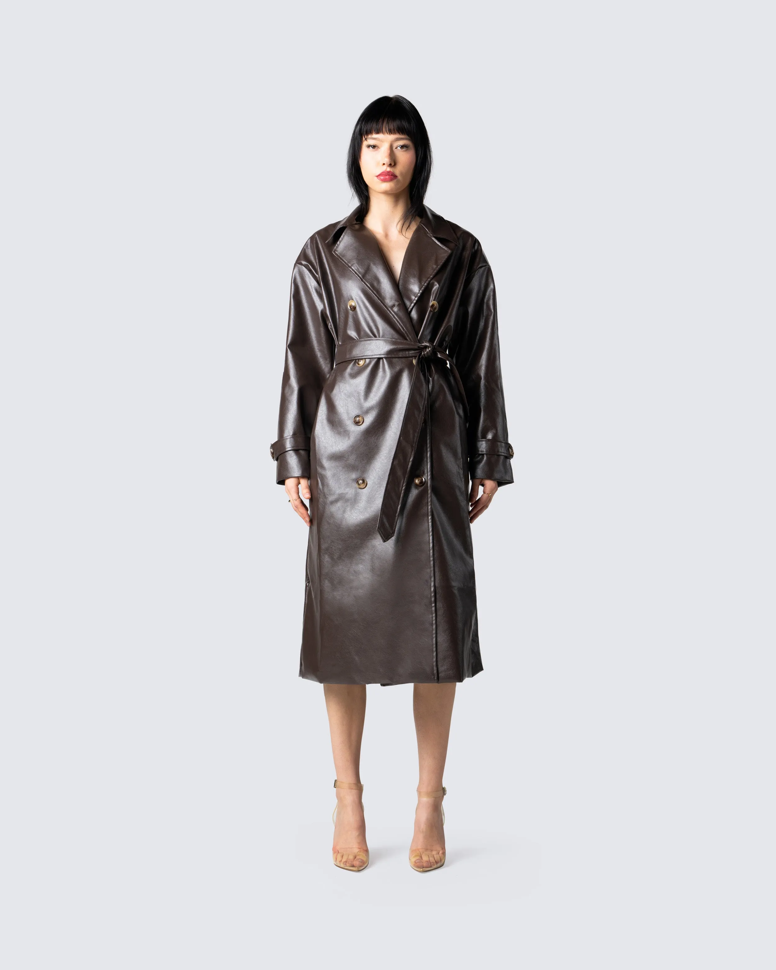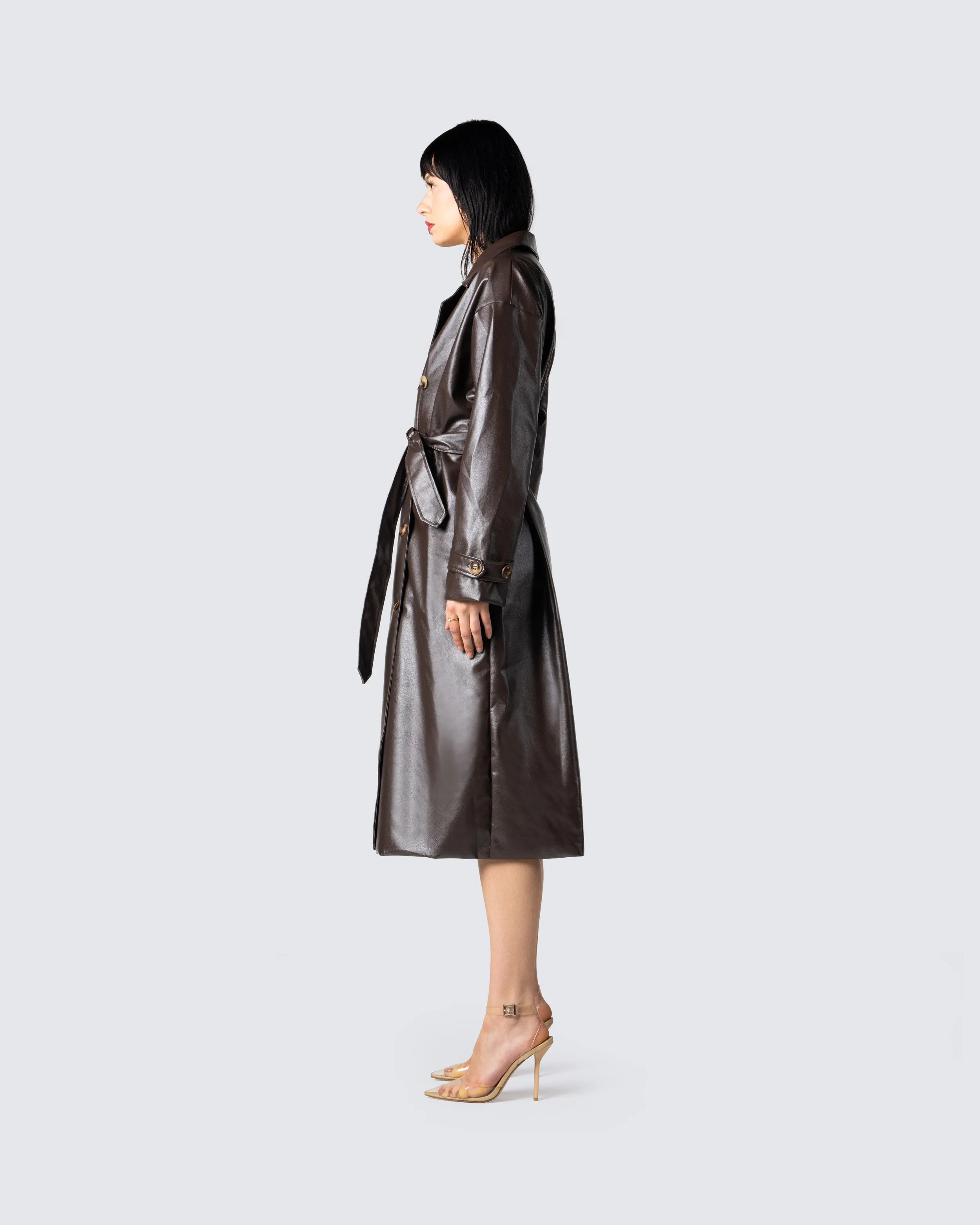 Bundle up and stay warm while still maintaining that boss b*tch look in this brown belted, leather trench coat - Hugging you in all the right places to snatch you up🤎