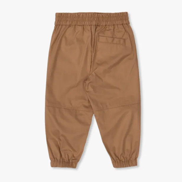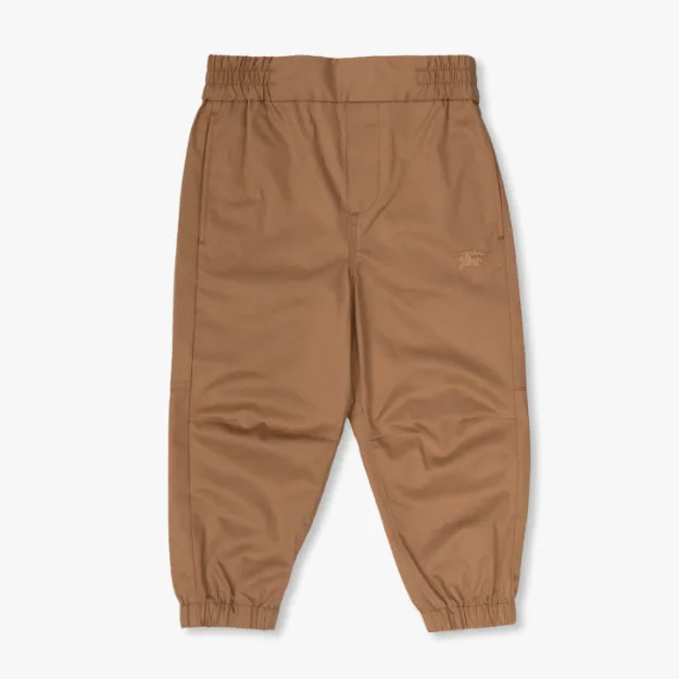 Casual cotton twill trousers for baby boys by Burberry, in the luxury brand's Archive beige. For a signature look, there is a small Equestrian Knight Device logo in tonal embroidery on one leg. Simply styled for a relaxed fit, they have elasticated ankle cuffs, knee tucks, discreet side pockets and a back pocket. The elasticated waistband allows easy pull-on.