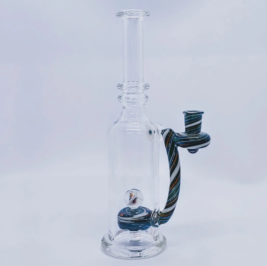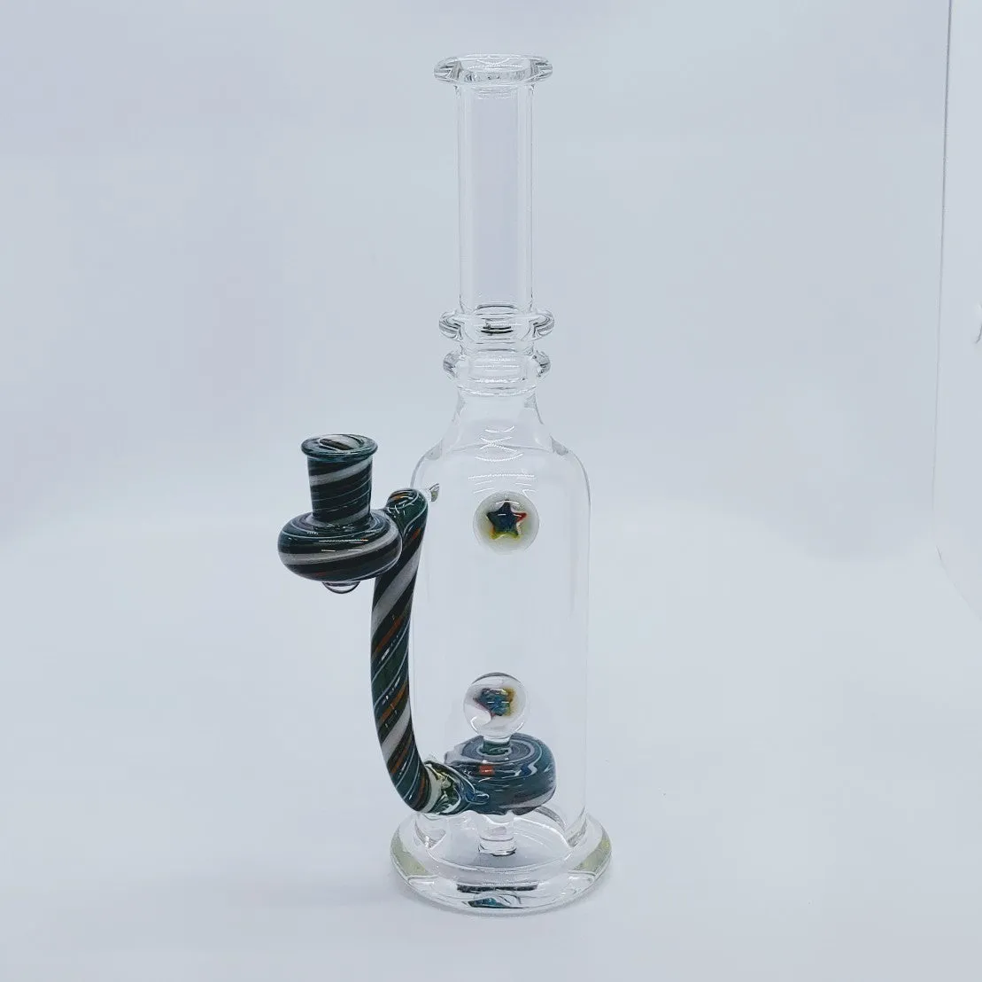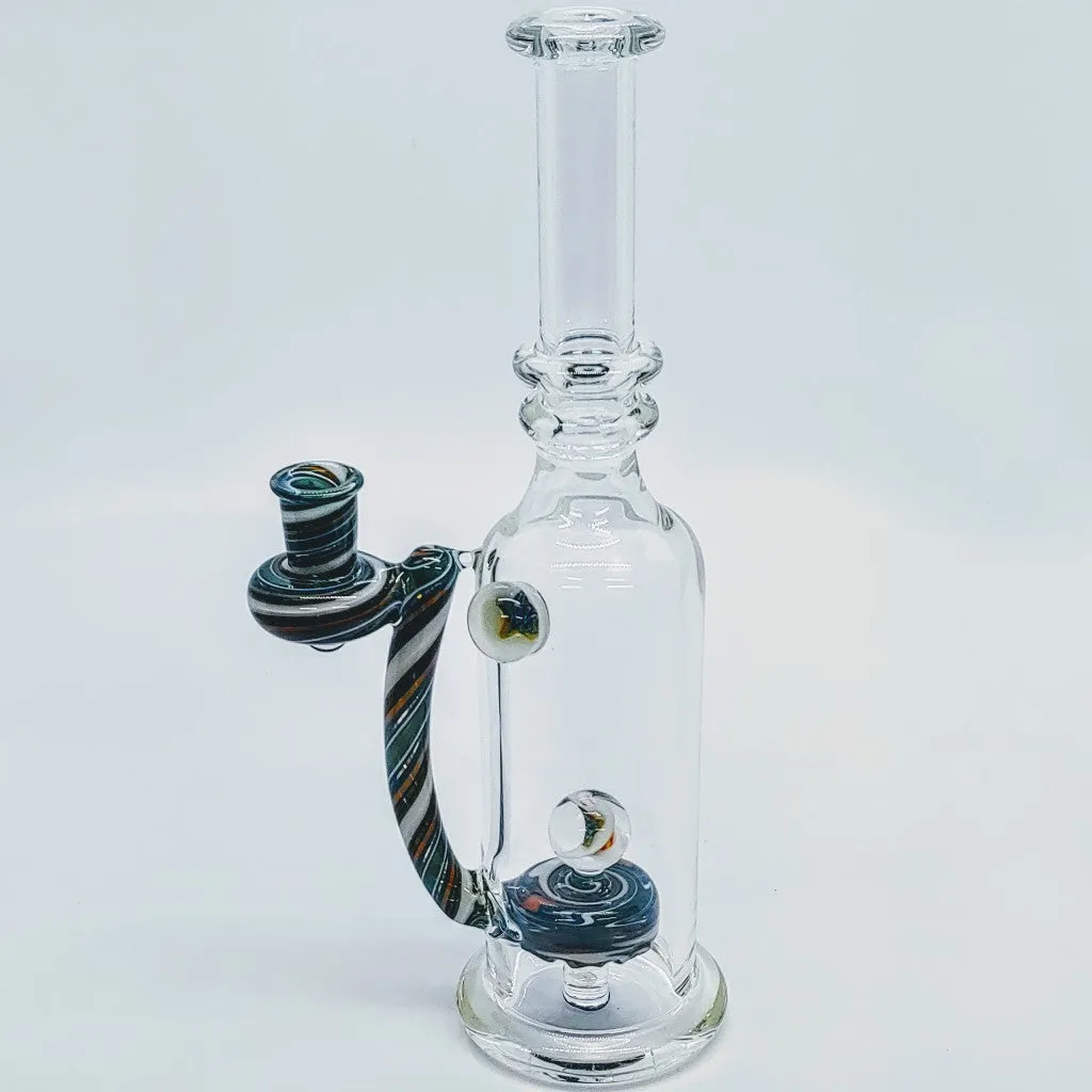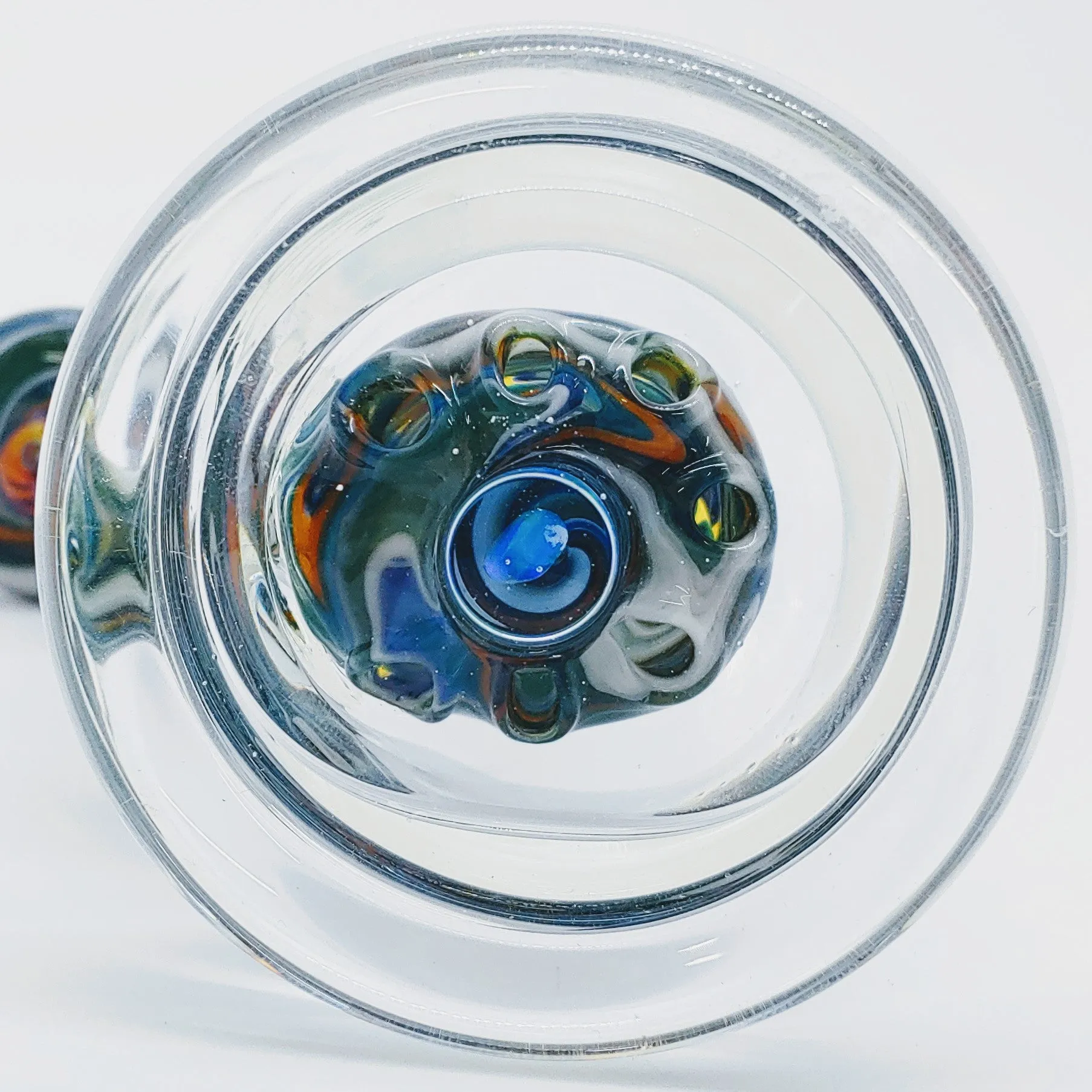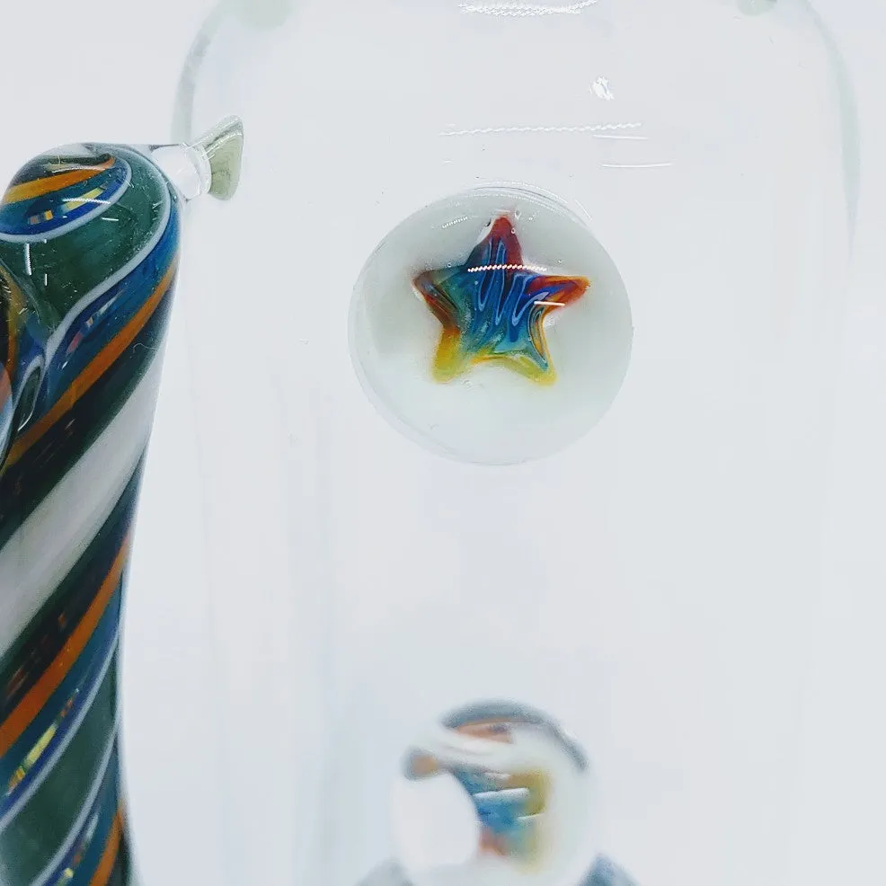 Clear 9" body with line workeddown stem to hollowed disc perc; Adorned with multi-murrini marble and milli attachment; Handworked 10mm female fitting