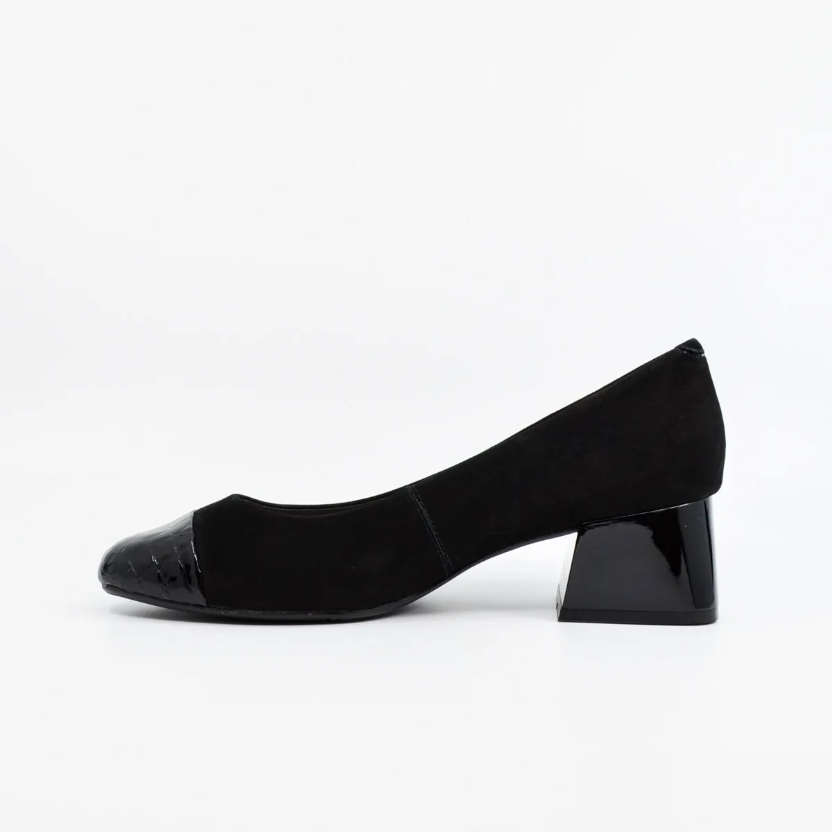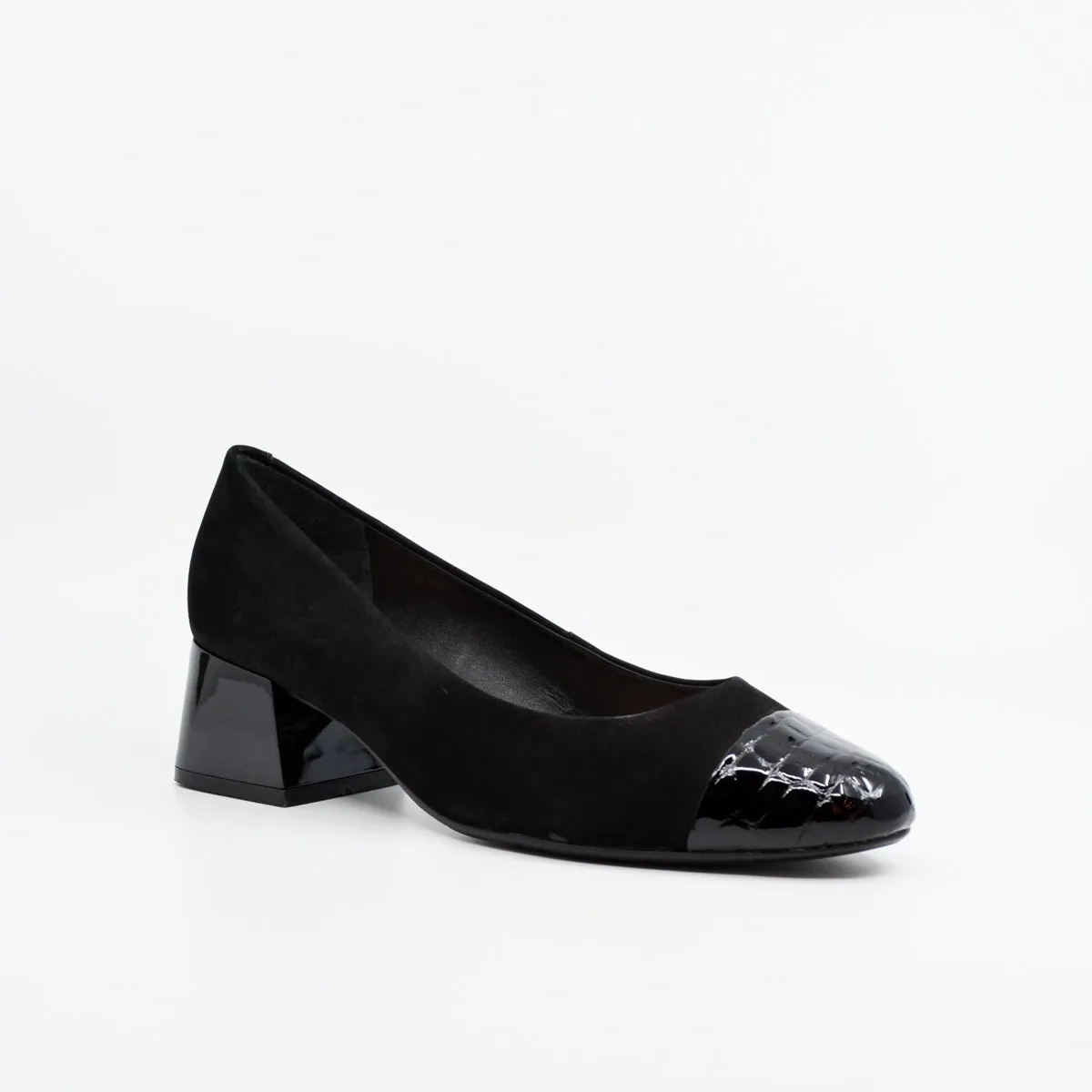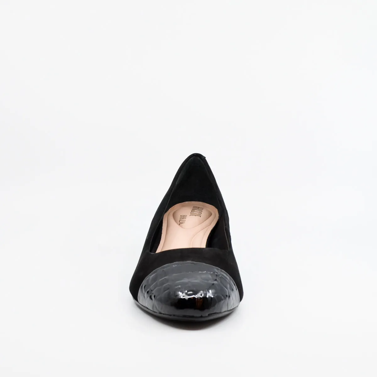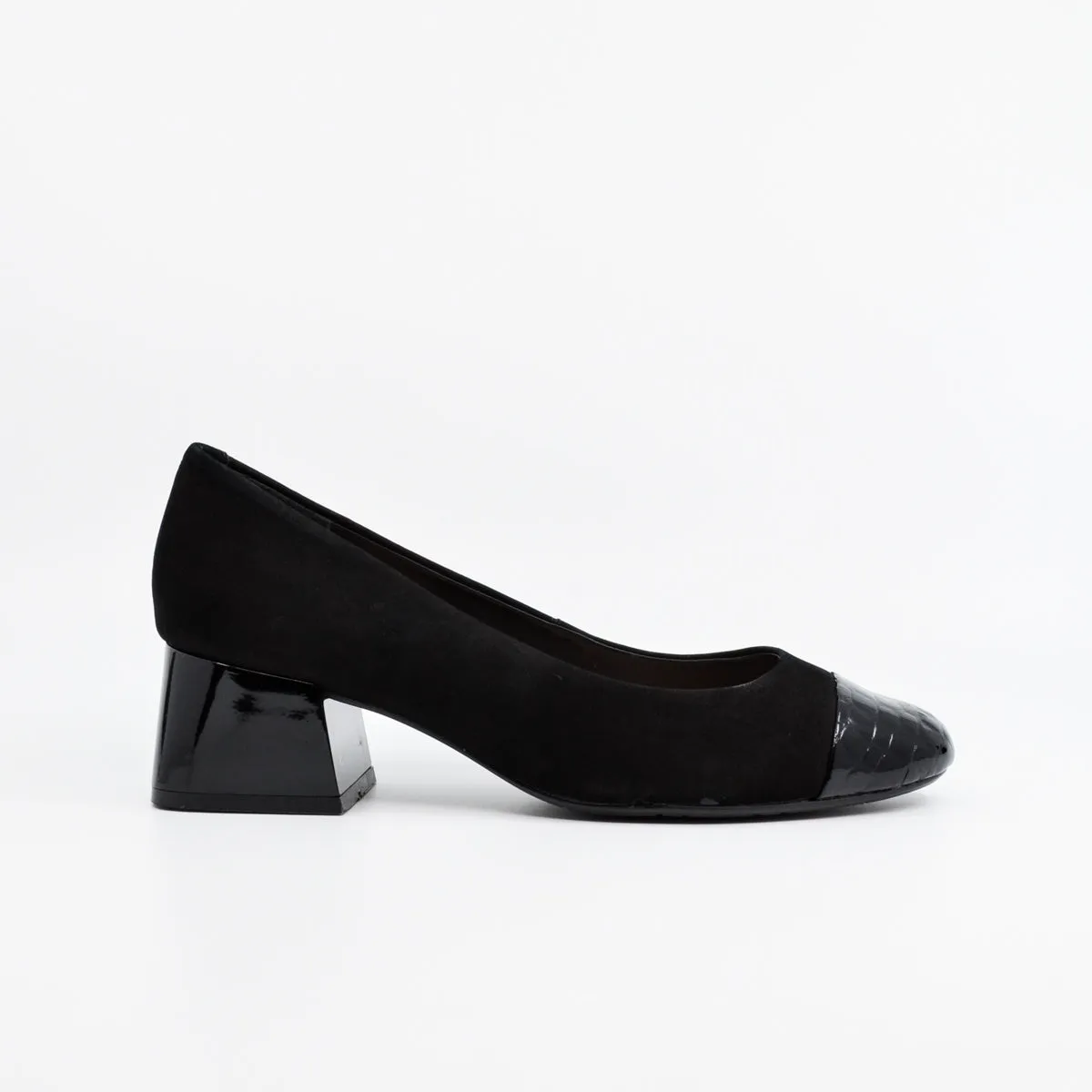 Classic soft leather pump with patent leather toe cap and shiny heel. Perfect for work or evening wear. Featuring a wide rounded toe, low block heel and cushioned insole. European sizing. Made in Brazil. Leather upper, leather lining, synthetic sole. Low heel.