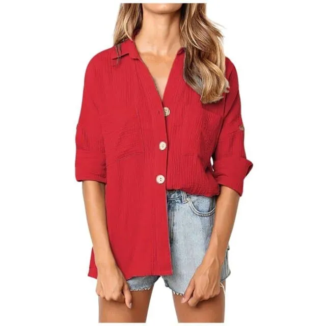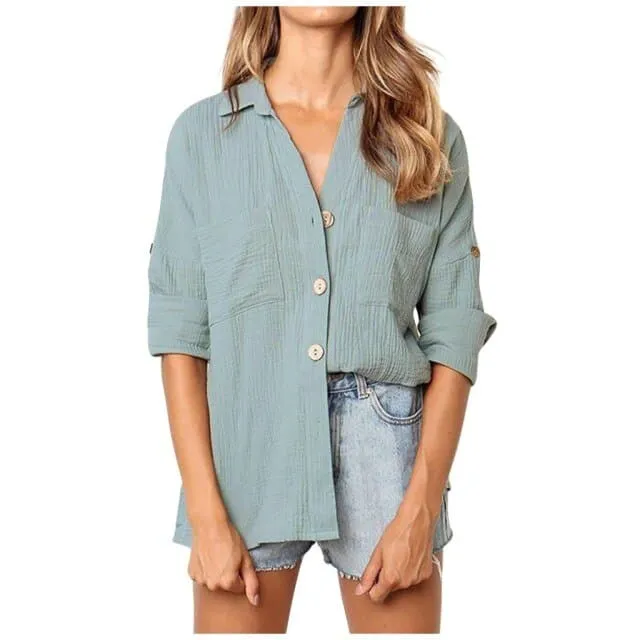 DressBetty - Fashion Women Loose Solid Color Turndown Collar Button Blouses Casual Autumn Cotton Linen Long-Sleeved Shirt