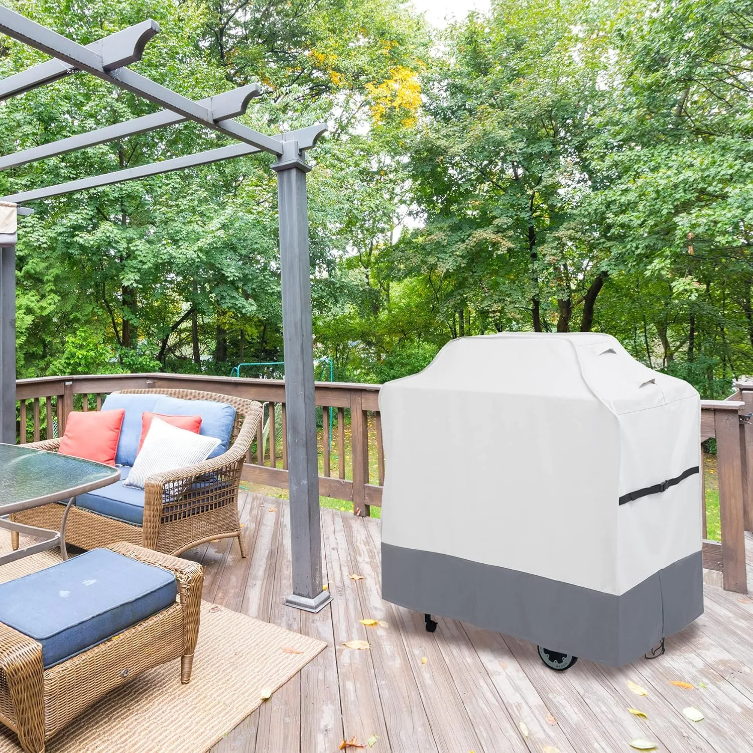 - Reinforced Padded Handles & Compression Straps: The reinforced padded handles make it easy to put on or remove the cover. The compression straps, equipped with secure buckles, keep the cover in place, even during windy days. Cleaning is a breeze; a simple wipe down with mild detergent, if needed, will do the job.