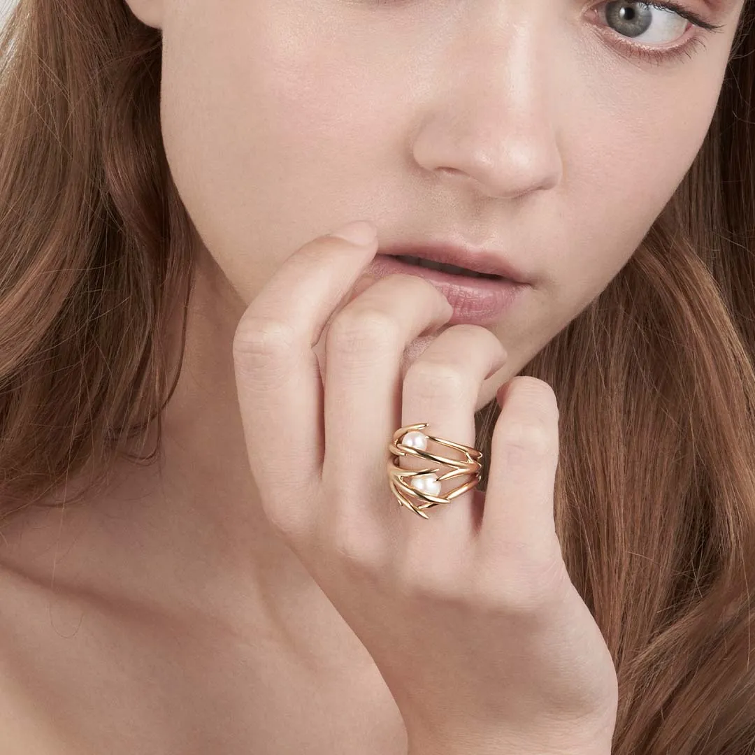 Handcrafted from yellow gold vermeil, a large freshwater pearl and a small freshwater pearl, our Hooked Pearl Ring is our unique and contemporary take on the classic pearl cocktail ring. Architectural, arched spikes of glistening gold vermeil cocoon the finger in a bejewelled domed-cage, nesting a pair of freshwater pearls within. Our House code, Line, is in its dynamic design, drawing forth Leane’s own fascination of barbed and blossoming forms. The Hooked Pearl silhouette - curled, curvilinear, generous - creates a voluminous envelopment of sharp lines and perfect pearls. Ravish.