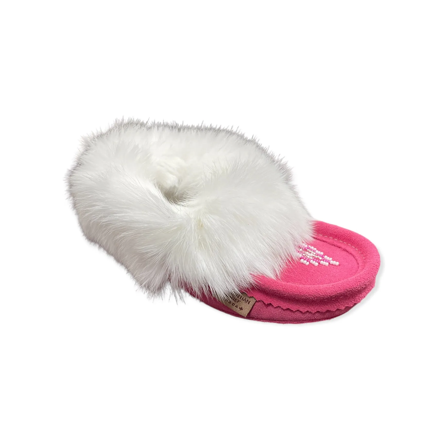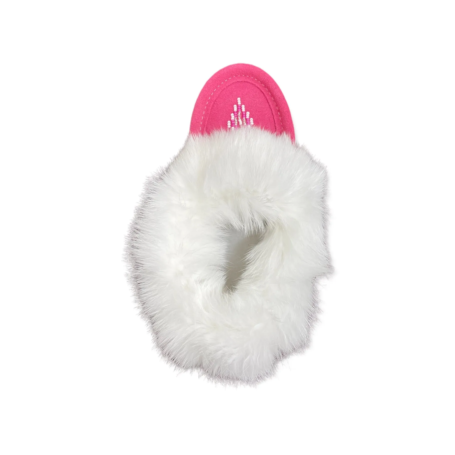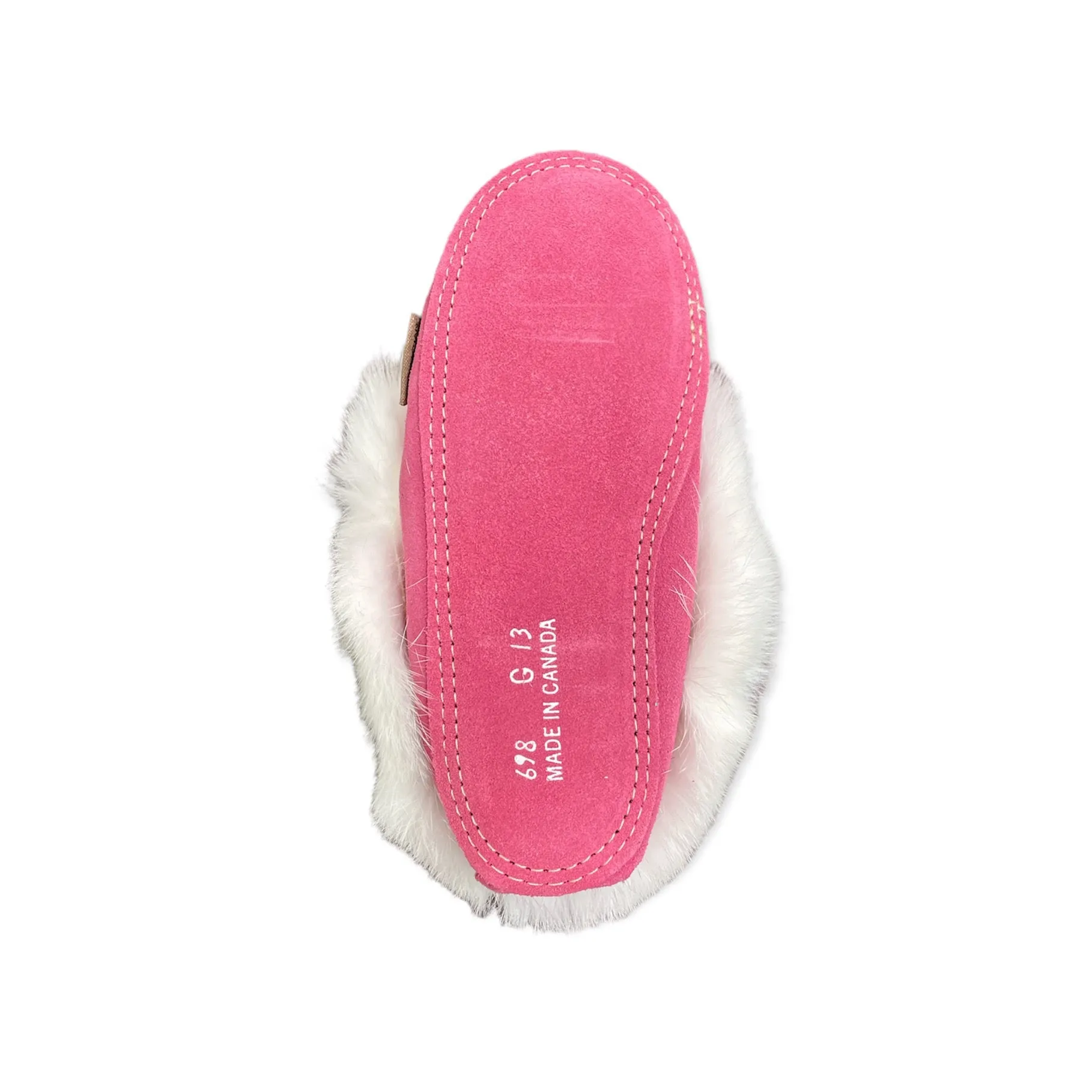 Laurentian Chief Kid's Fur Moccasin in Fuchsia suede.