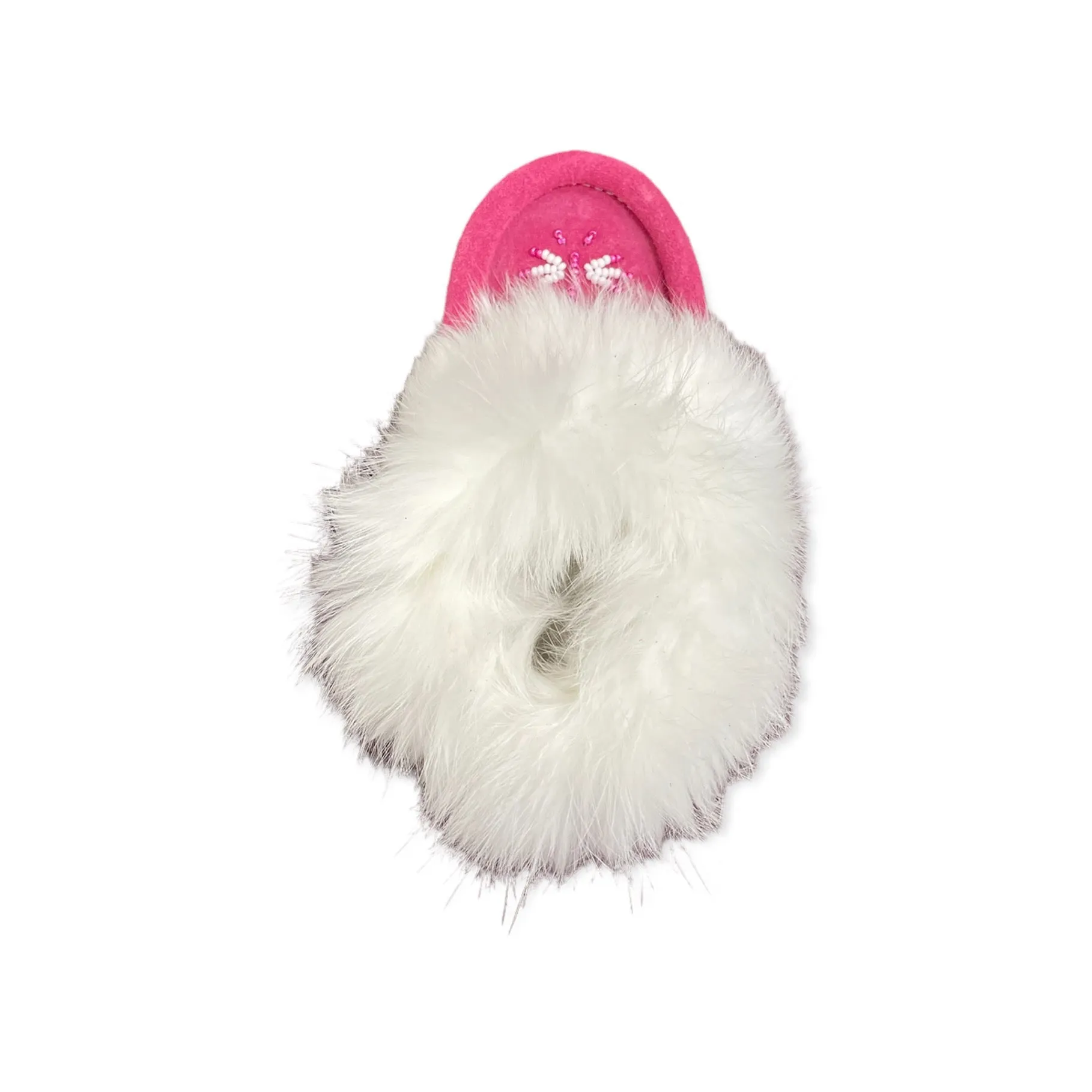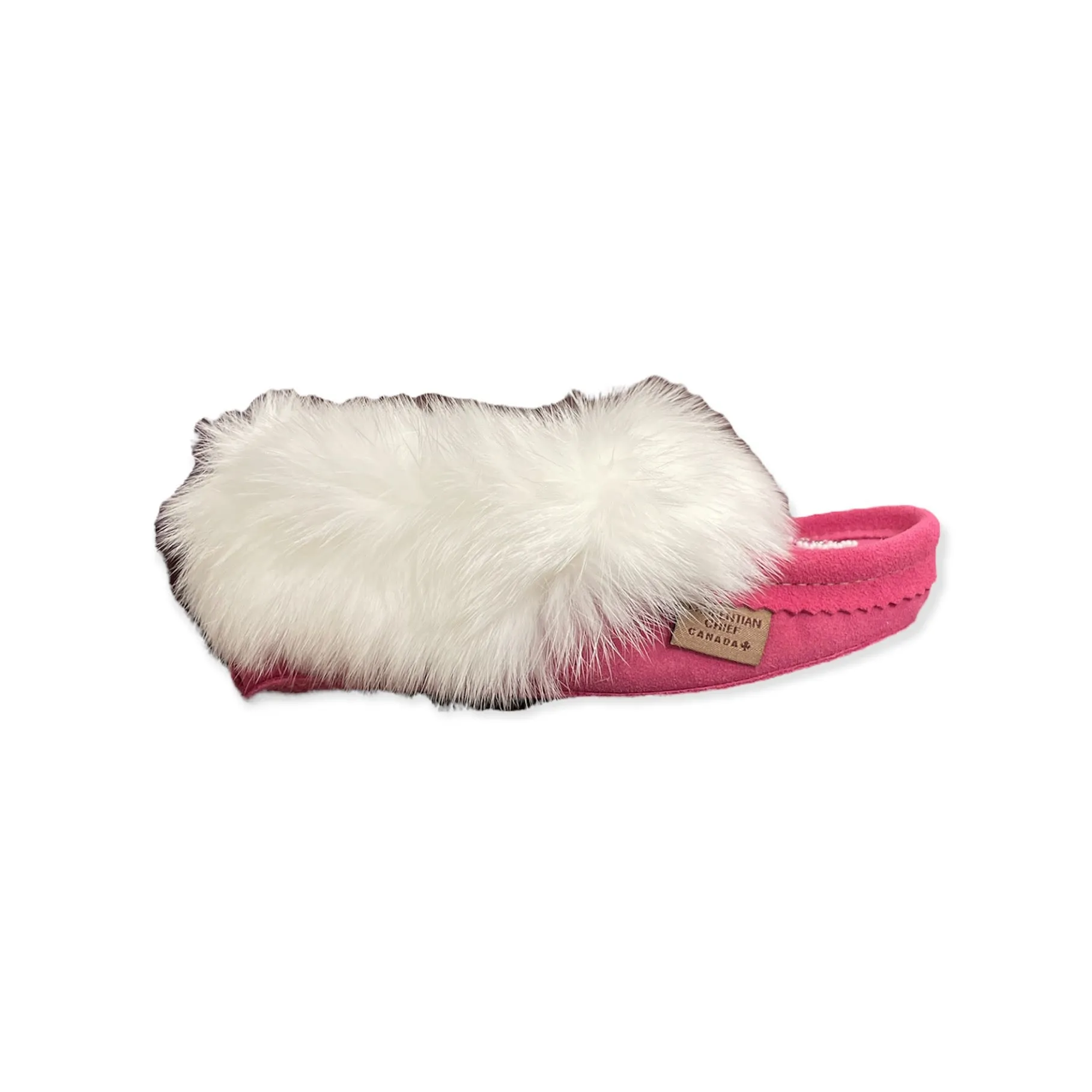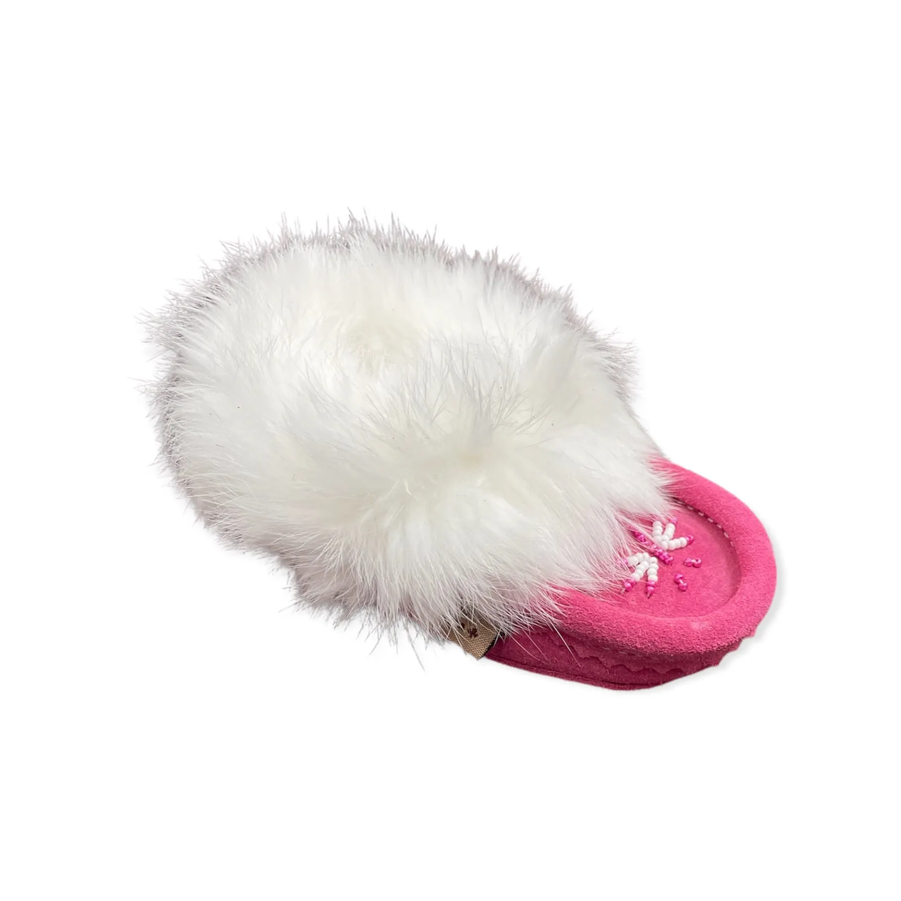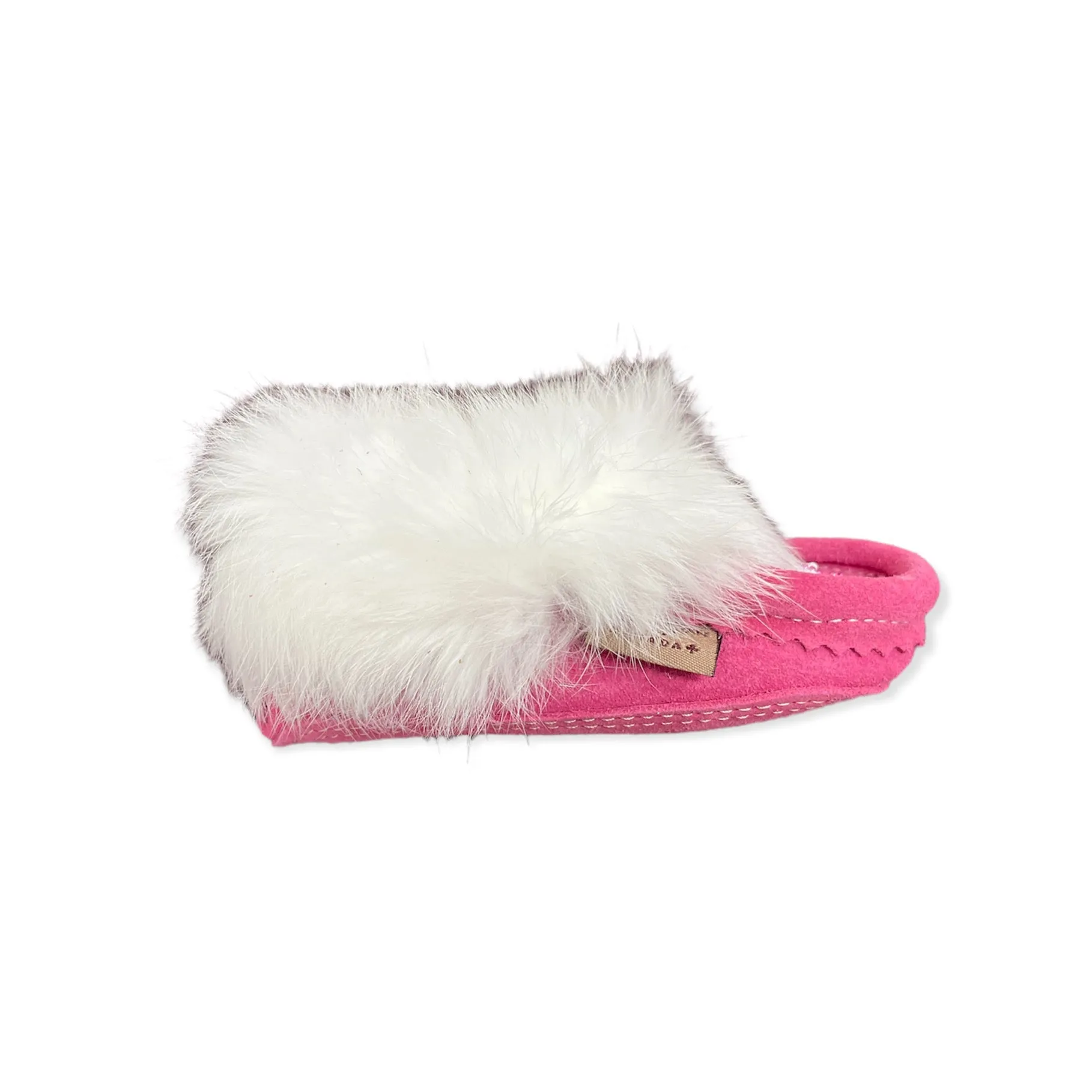 Laurentian Chief Kid's Fur Moccasin in Fuchsia suede.