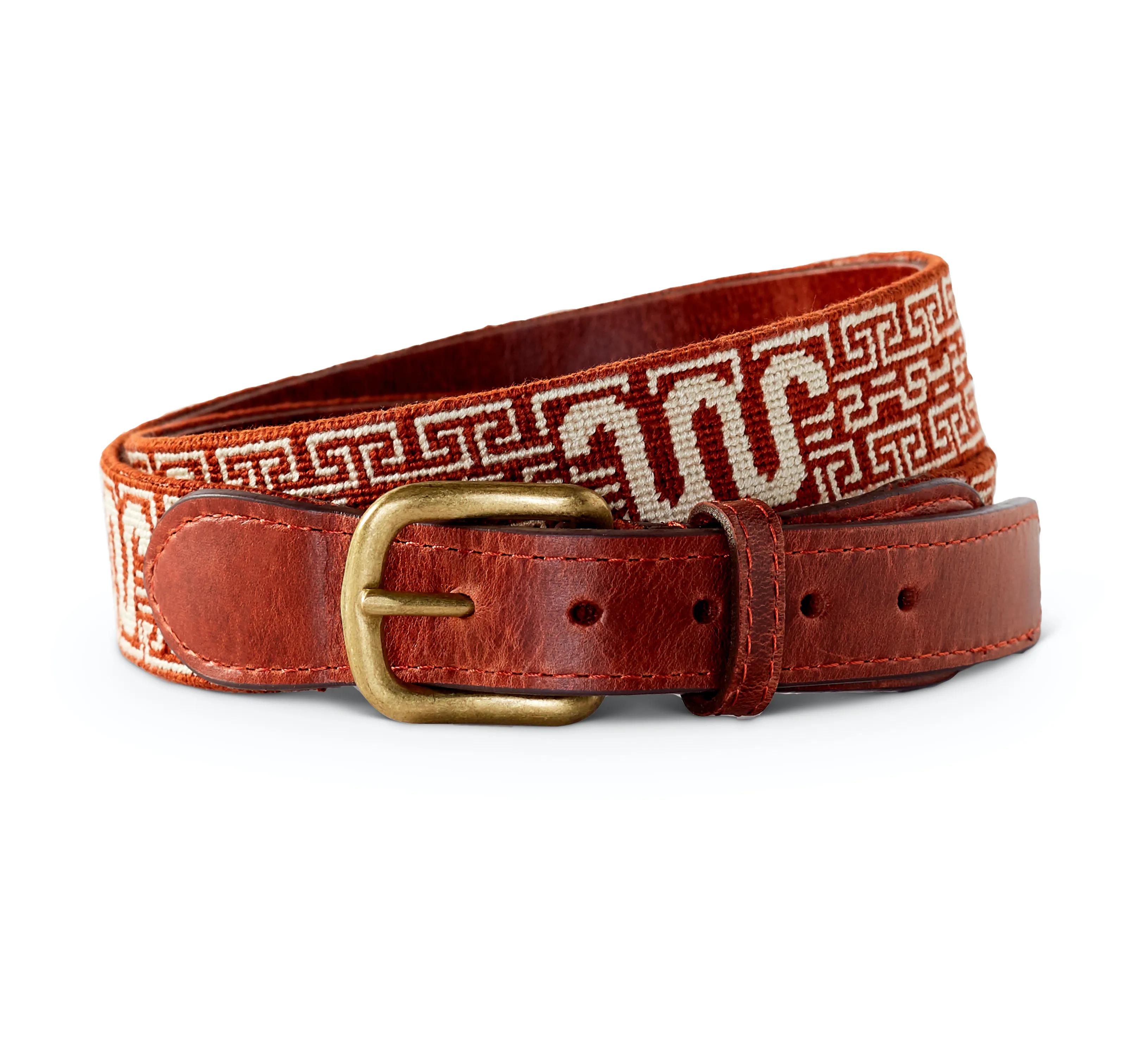 This original collection had been designed, using a famous rug from the King Ranch Main House. The belt is 100% hand stitched needlepoint using French cotton thread. Made with brown Italian leather and finished with a brass buckle, each belt comes in a wooden gift box. A very special and unique gift for that special guy in your life.