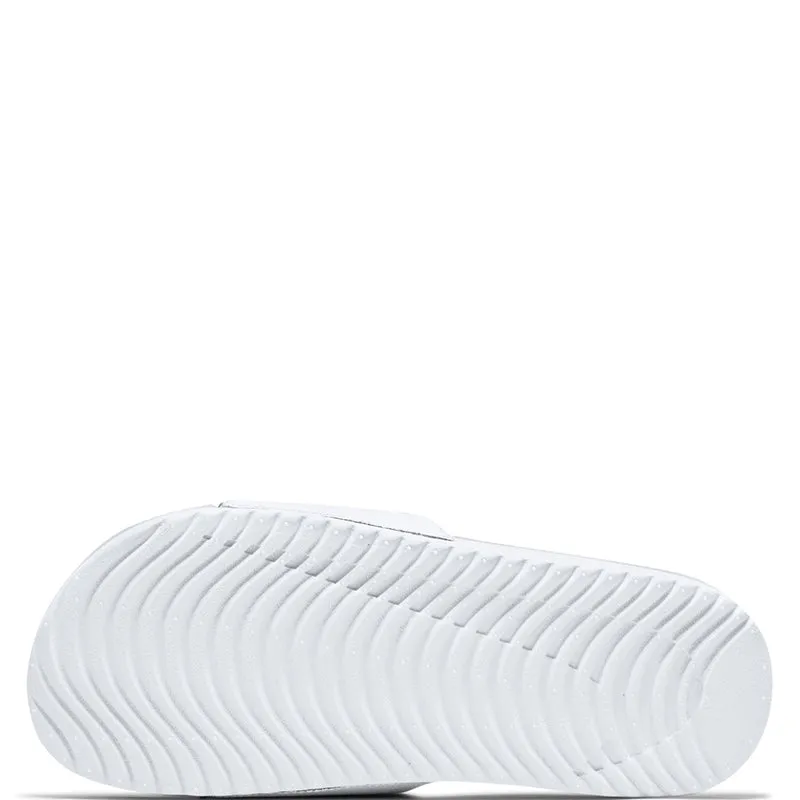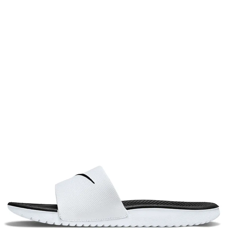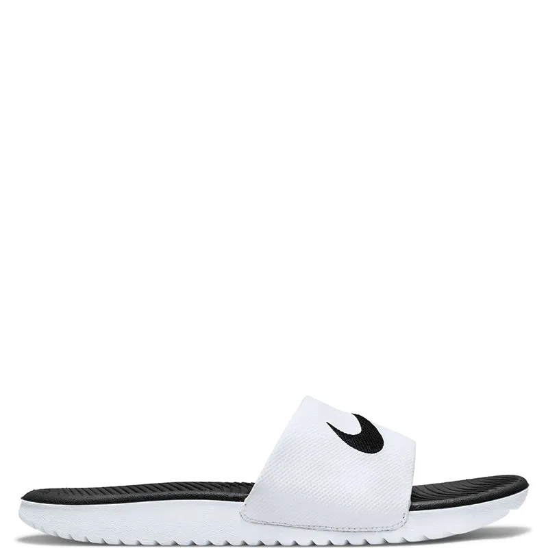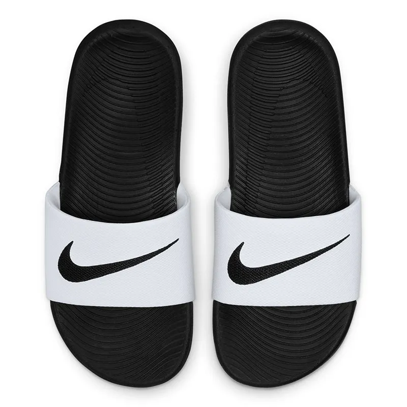 Nike Kawa Little/Big Kids' Slides SLIDE INTO SOFT STEPS. The Nike Kawa Slide is your super easy slip-on for any time. With a soft and flexible design, these sandals help growing feet recover after practice, playtime or any adventure (like a beach day). Wavy grooves in the sole make the slide flexible so every step feels natural. A soft synthetic strap secures your foot. Soft foam underfoot provides a plush feel. Synthetic Leather Polyester Text