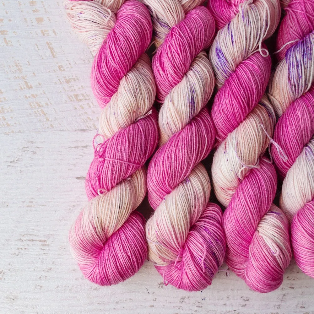 One half of the skein has been dyed in our Soft Blush colourway the other half Orchid.