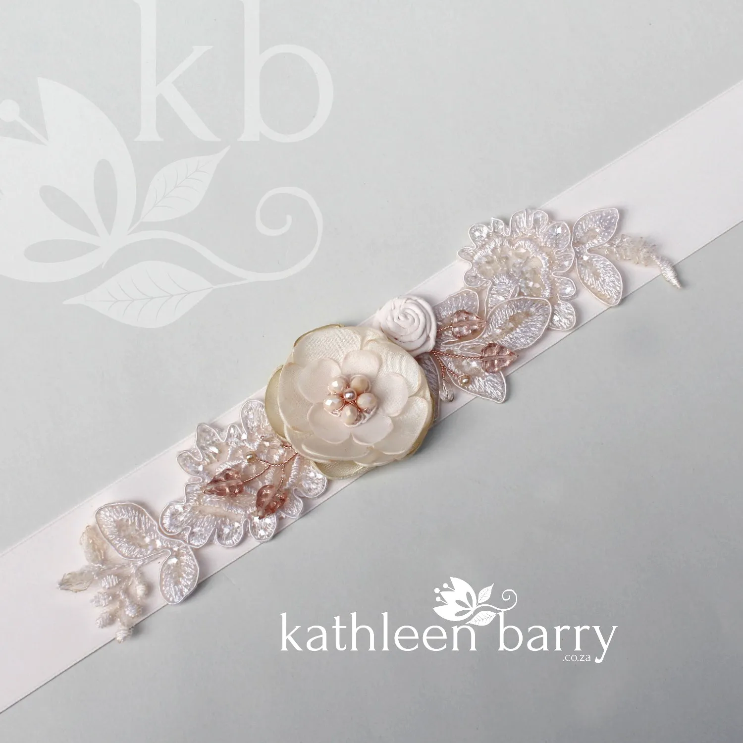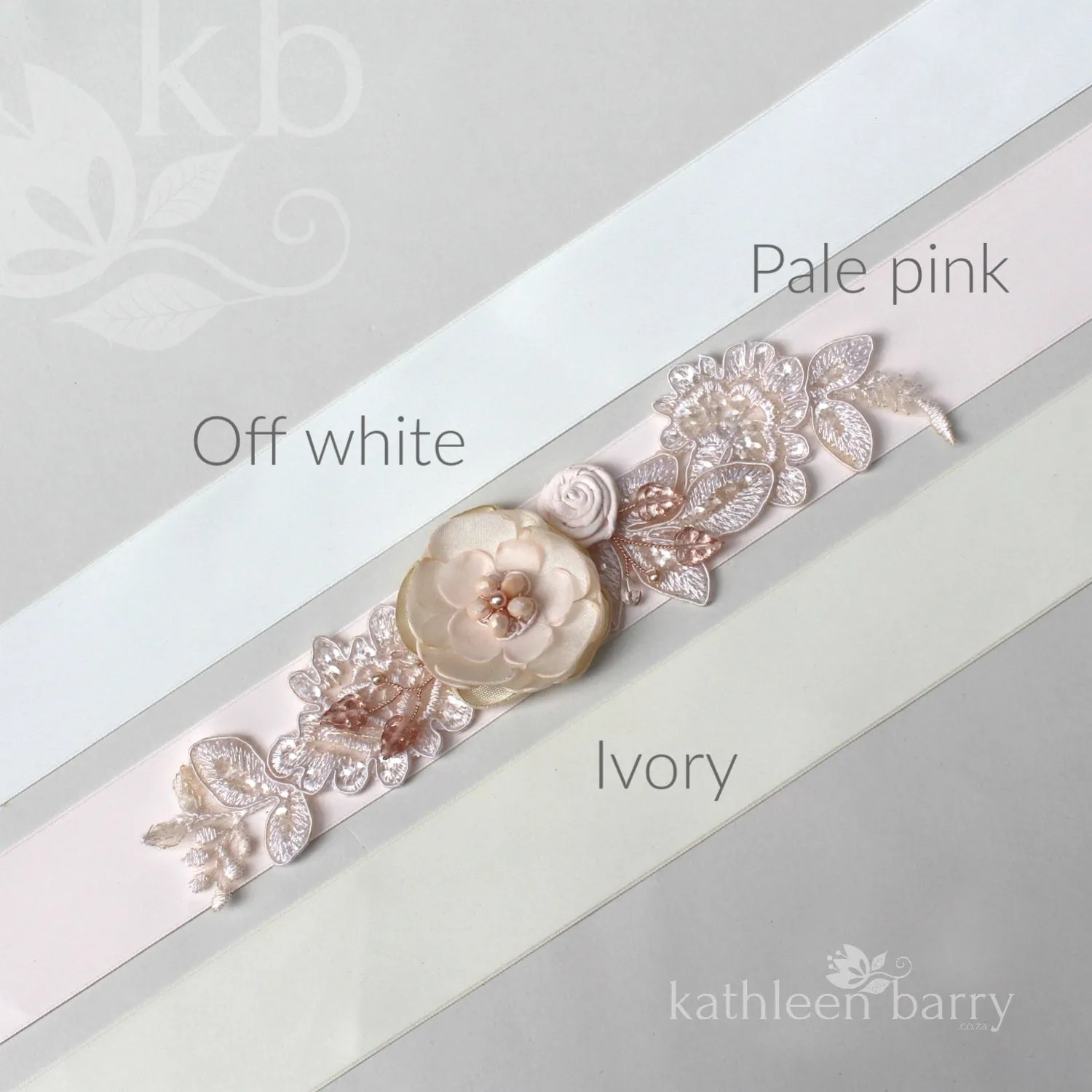 Wedding dress sash Bridal belt with Corded Bridal Lace, handmade luxury fabric flowers, Metallic Czech glass leaves (matched to wire-work choice) with pearls and crystals on. The perfect addition to finish off any dream wedding dress for Brides that want that little something extra special and unique.
