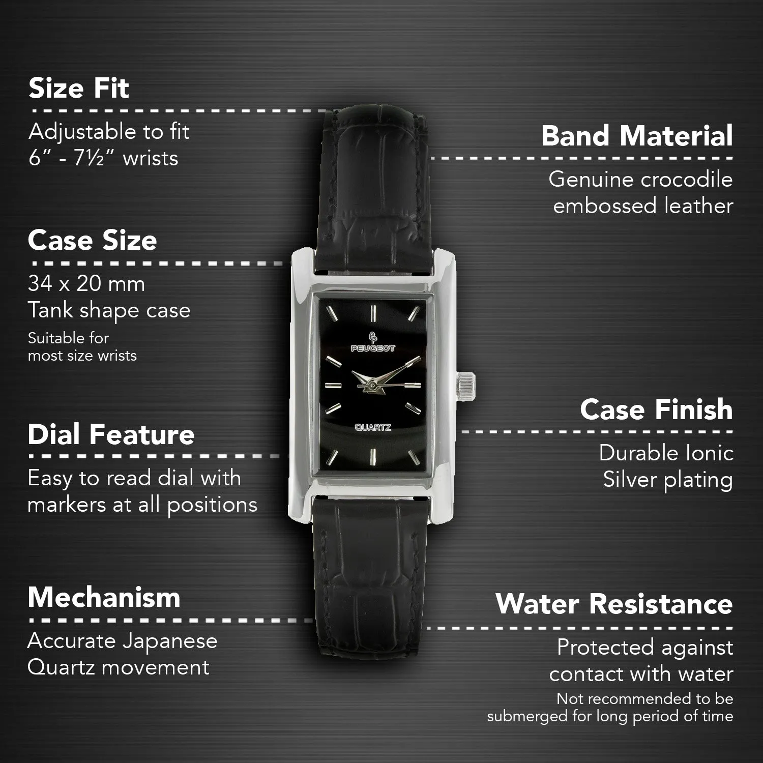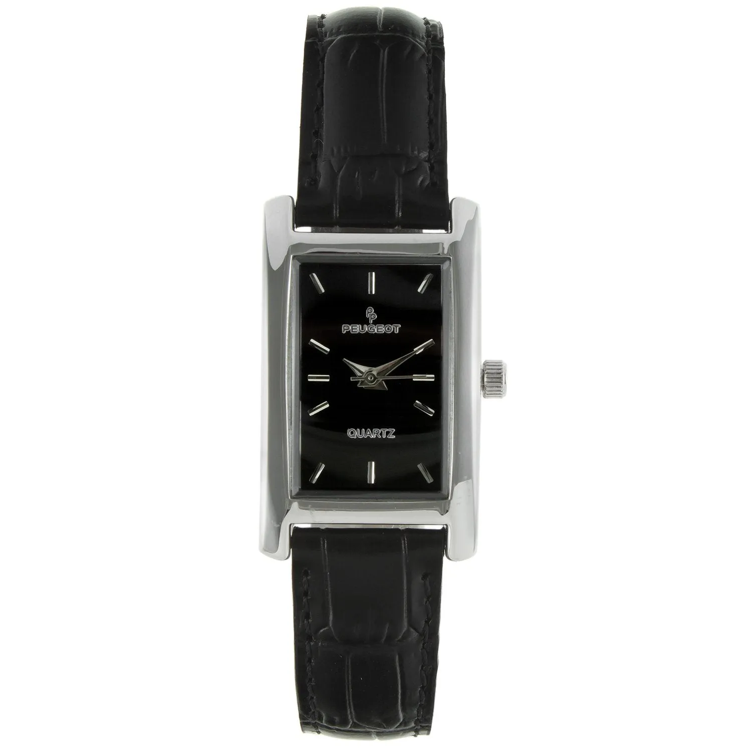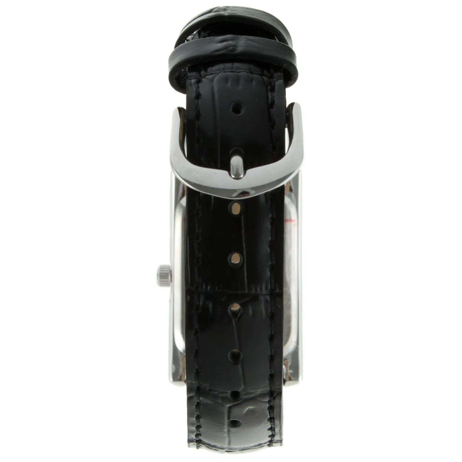 The thin design of this leather strap watch lends this watch a sleek, graceful style. This timepiece features a rectangular silver-tone case and bezel, the high polished silver-tone accent the dial and band for an overall sharp look.Black dial and indices at each hour position and hour, minute, and second hands. The black slender strap is genuine leather and offers a comfortable fit with a secure buckle clasp at the back.