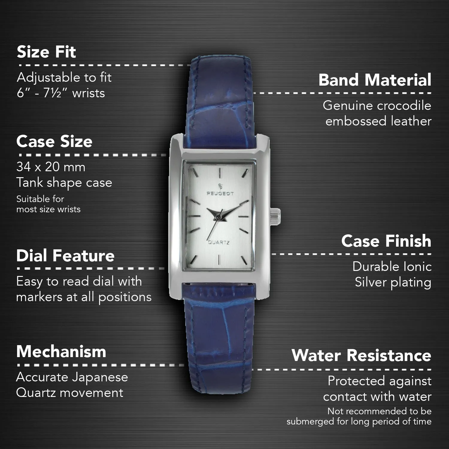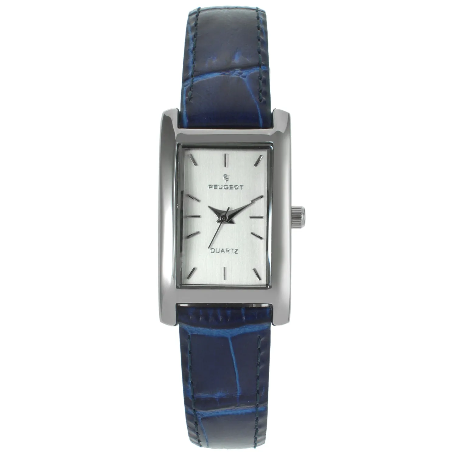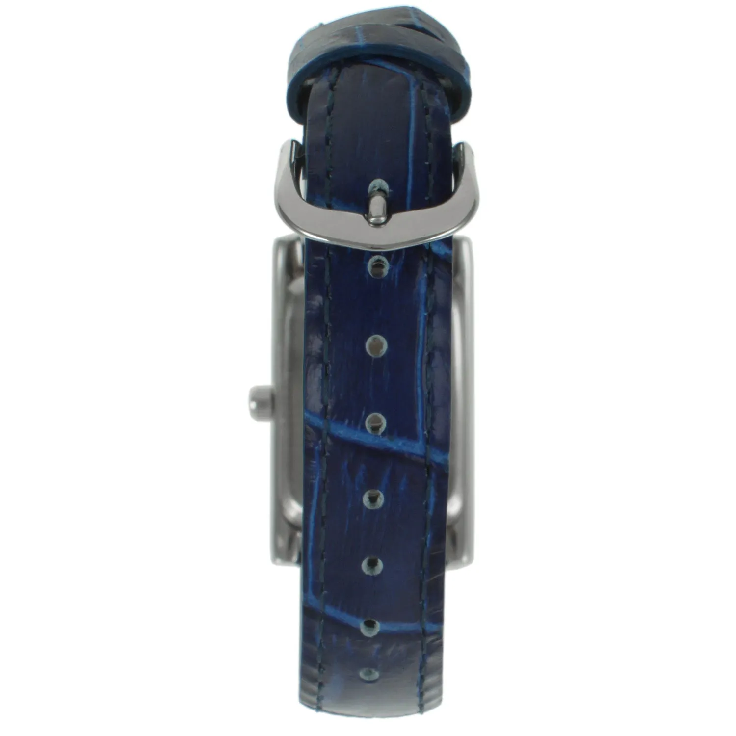 The thin design of this leather strap watch lends this watch a sleek, graceful style. This timepiece features a rectangular silver-tone case and bezel, the high polished silver-tone accent the dial and band for an overall sharp look. Silver dial and indices at each hour position and hour, minute, and second hands. The blue, slender strap is genuine leather and offers a comfortable fit with a secure buckle clasp at the back.